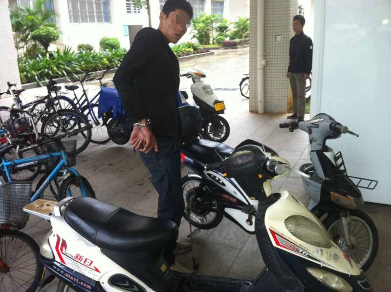 我处2012年12月1日晚在16号楼抓获盗窃嫌疑人林某帝(男、海南澄迈人,吸毒人员),移交人民路所后因身体有病无法关押,释放后,嫌疑人林某帝不思悔改,于2012年12月5日下午再次窜到我校五号教学楼盗窃一辆电动车和电动车电池时被守候的“猎鹰”队员抓获,现场缴获被盗电动车一辆、电池一块和作案工具若干。