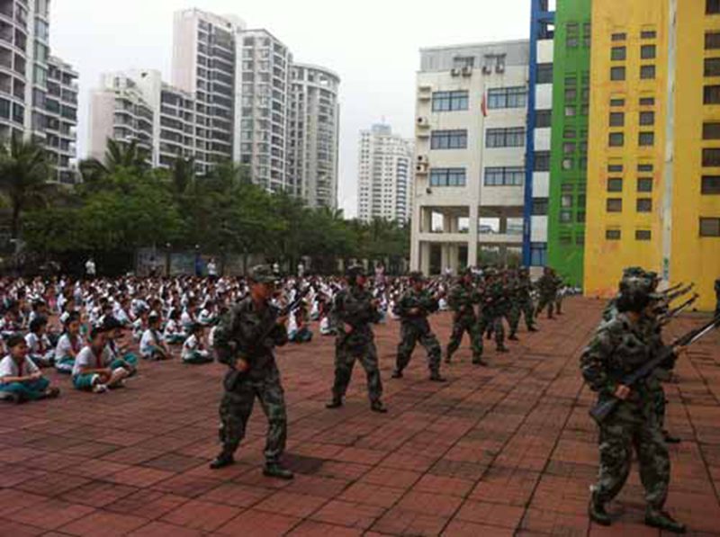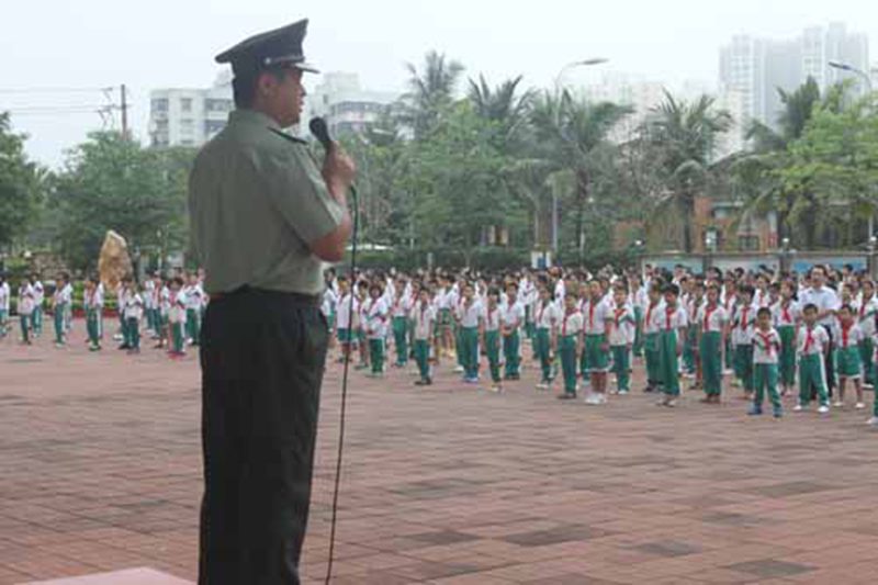 2013年4月1日上午,应海口寰岛小学的邀请,我部黄海宁部长到海口寰岛小学为1300名学生做了一场题为《牢记历史,珍惜今天幸福生活》的革命传统教育报告,重点介绍了海南琼崖纵队的英雄事迹。报告结束后,我校学生教官队为小朋友们表演了刺杀操。