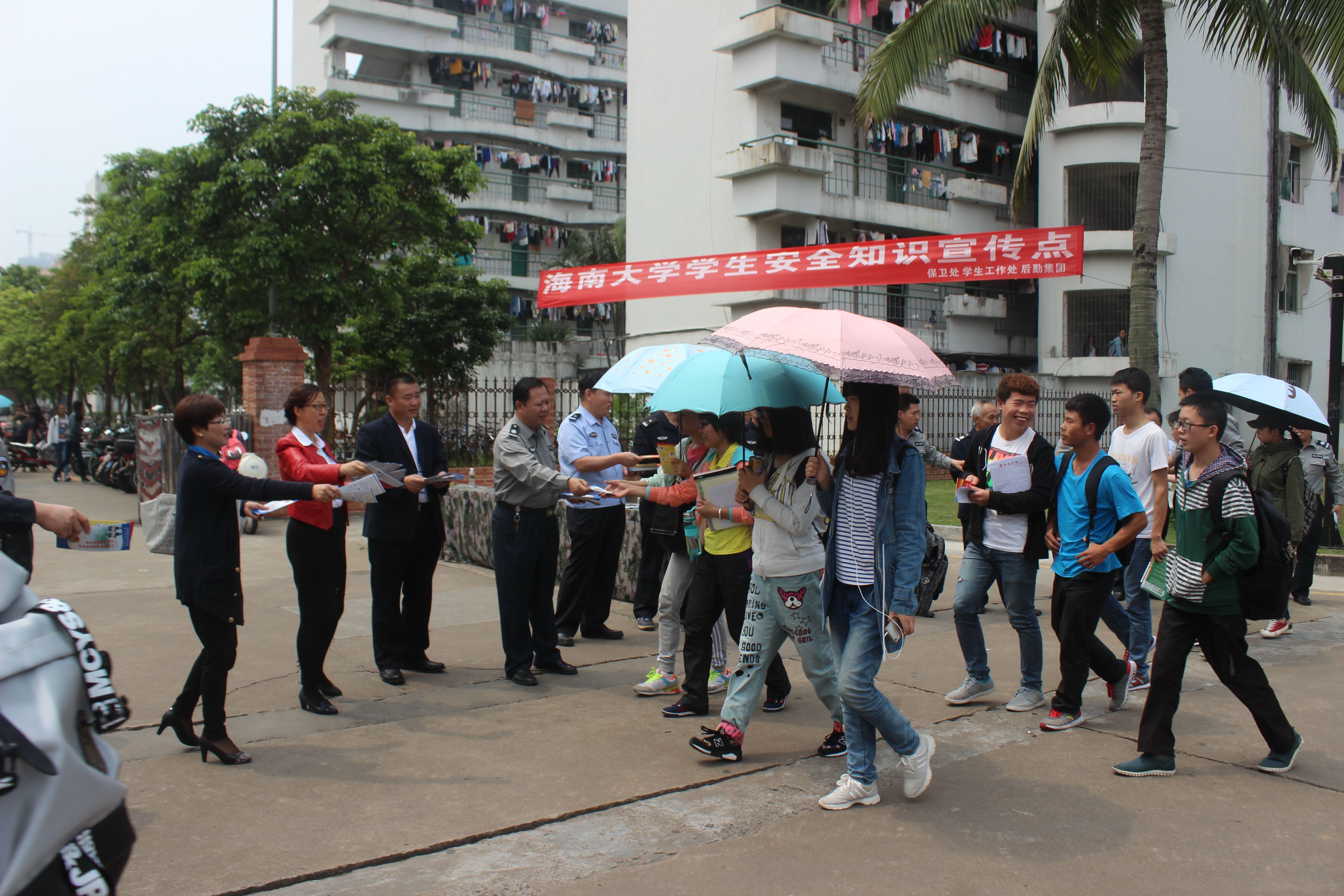 为了增强我校广大学生的安全防范意识,提高防盗窃、诈骗、抢劫、抢夺等方面的能力,确保广大学生的生命和财产安全,我校保卫处、学生工作处、后勤集团等部门会同海口市公安局美兰分局人民路派出所,于3月30日上午在学生宿舍区举办学生防盗、防骗、防抢的安全知识教育活动。