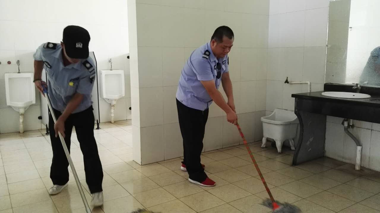 校卫队员协助师生事务保障中心做好教学楼卫生间的清扫工作,为师生服务