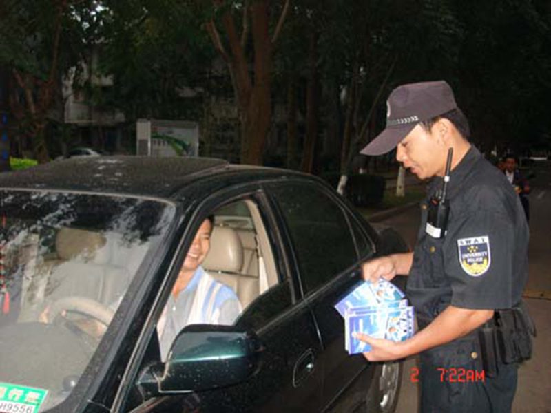 “尊敬的老师、司机朋友,欢迎您进出入我校校园。为保障您的交通安全,请遵守校园交通提示,请认真阅读交通安全指南及温馨提示,……”。2009年11月2日清晨6点整,天尚蒙蒙亮,且带着阵阵狂风和一丝丝凉意,一颗颗警徽依旧闪耀在我校区门岗上,耐心、细致的给进出入我校园的车辆发放和讲解《海口市道路交通安全服务指南》及“william威廉亚洲官方保卫关于校园交通安全温馨提示”。这是我处在近期进一步加强整顿校园交通环境,确保校园治安井然有序,维护良好的校园交通秩序及行车安全、主干道上交通畅通,提高校园交通文明、安全的意识,积极给予广大师生提供的一项校园交通便 民服务的举措。