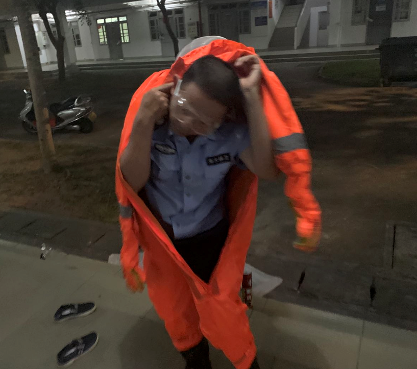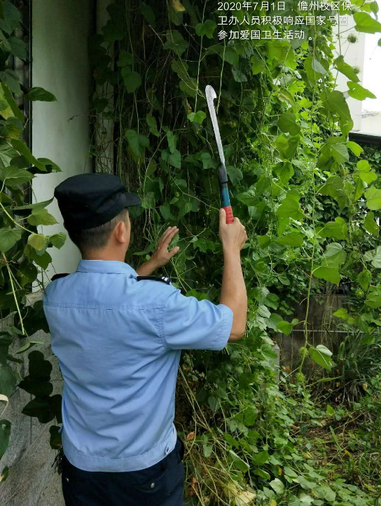 2020年7月1日上午10:00时许,儋州校区保卫办协同后勤环卫部门人员积极响应国家的号召参加爱国卫生活动。在炎炎烈日下保卫办人员热情高涨不惧蚊虫叮咬,挥洒着汗水手持砍刀清理校区围墙边上的杂草。校园内经常有排蜂在宿舍楼宇横梁上做窝,保卫办人员身穿防蜂服手持黑旋风一举将蜂群消杀干净为校区的安全清理了隐患。针对校区监控探头时常被树枝覆盖以及蛛丝的遮挡,保卫办人员借助人字梯进行作业,及时有效的清理监控上的树枝覆盖及蛛丝遮挡很好的维护了监控设备的运行。在这特殊日子里,保卫办的同志以实际行动庆祝党的生日。