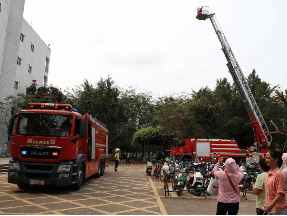 海口市消防指挥中心也对本次活动给予了很大的支持,接到模拟报警后,出动了一台消防云梯车和一台消防水罐车,模拟在图书馆广场处对图书馆顶楼被困人员进行救援和对馆内进行灭火操作。随后,救援队向活动总指挥骆清铭校长报告,“火情已经扑救完毕,馆内已无被困人员,本次事故无伤亡”。