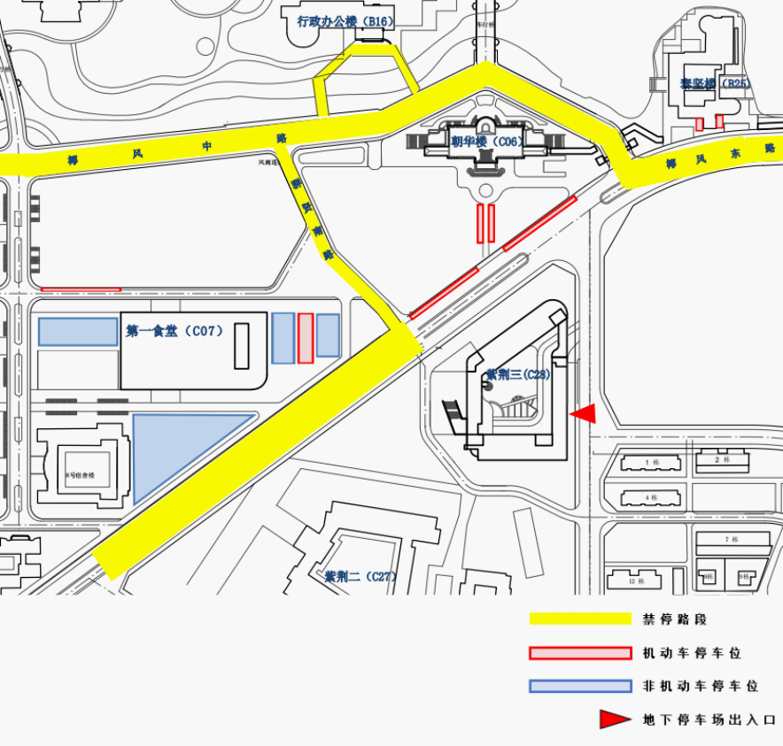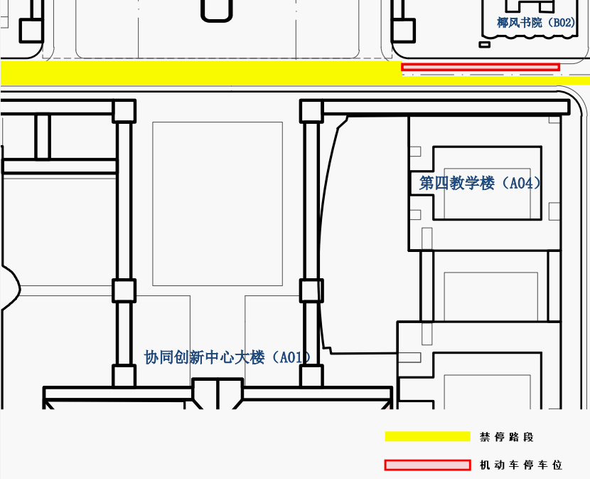 三、第一食堂(C07)北侧、第四教学楼(A04)与椰风书院(B02)之间路段空间有限、道路狭窄,虽然规划了部分车位,但远不能满足上课、就餐师生停放机动车的需求。呼吁广大师生要按划线区域有序停放车辆,上下课、就餐等通行高峰期尽量步行前往,避免造成道路拥堵。