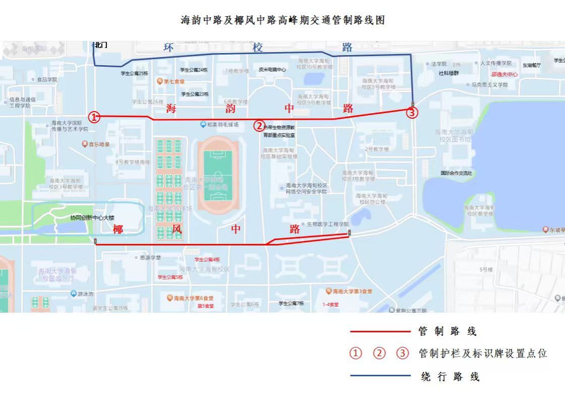 平安美丽校园建设是大家共同的责任,每天学生上下课期间,学校海韵中路和椰风中路两条主要道路的多个路口短时间形成人流高峰期。第三、四、五号教学楼到学生宿舍核心区之间多个路口集中通行的学生瞬时超过上万人,时间持续10多分钟。为确保师生通行安全,提高步行和机动车通行效率,现结合实际情况,对部分路段和时段的交通管制措施进行优化调整,错峰通行。现将具体事项通知如下: